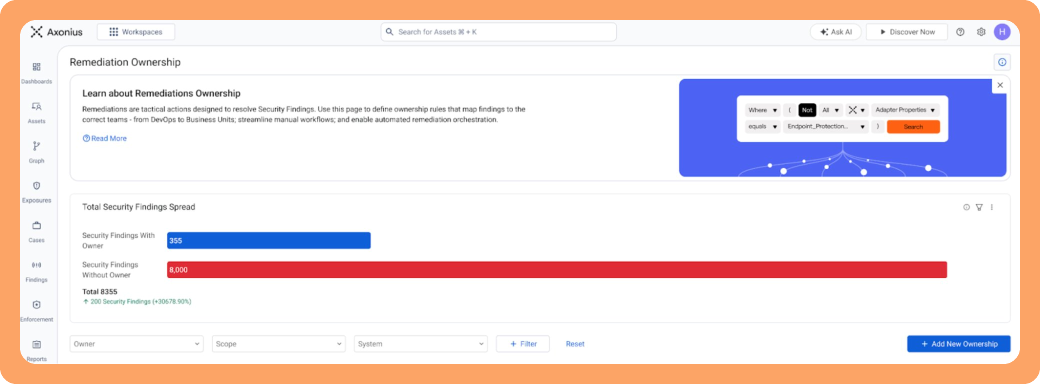 This works across all 40+ asset types and 1,400+ adapters supported by Axonius, so you can manage all exposures in one place.