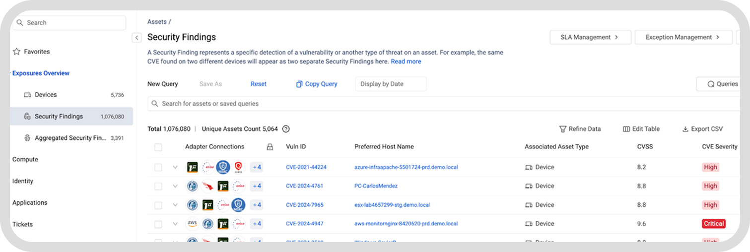 CISA’s Edge Device List also calls out vulnerabilities applicable to those devices. Axonius has the National Vulnerabilities Database (NVD) built into the platform and integrates CISA’s Known Exploited Vulnerabilities (KEV) catalog through the Exposures module. You can continuously map KEVs to discovered assets and directly correlate them with EOS edge devices to prioritize what’s being actively targeted.