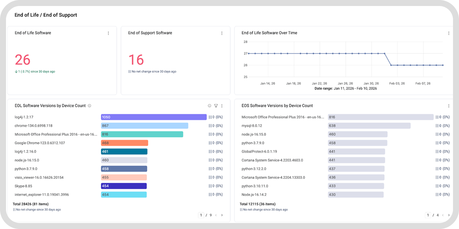 With historical reporting features, you can maintain auditable records of discovery, remediation, and enforcement activities. This allows you to demonstrate sustained compliance over time and show clear alignment with CISA’s mandate to continuously identify, track, and refresh all edge devices.