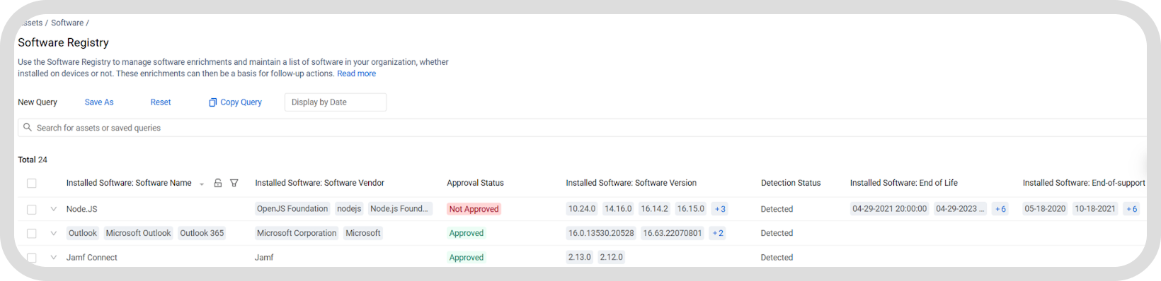 Additionally, the Software Registry allows you to designate software approvals based on agency-specific software policies. You can input EOS dates for specific software versions, label them as “Not Approved,” and enforce policy accordingly. This complements the Axonius Catalog metadata and allows you to easily detect new installs of EOS software.