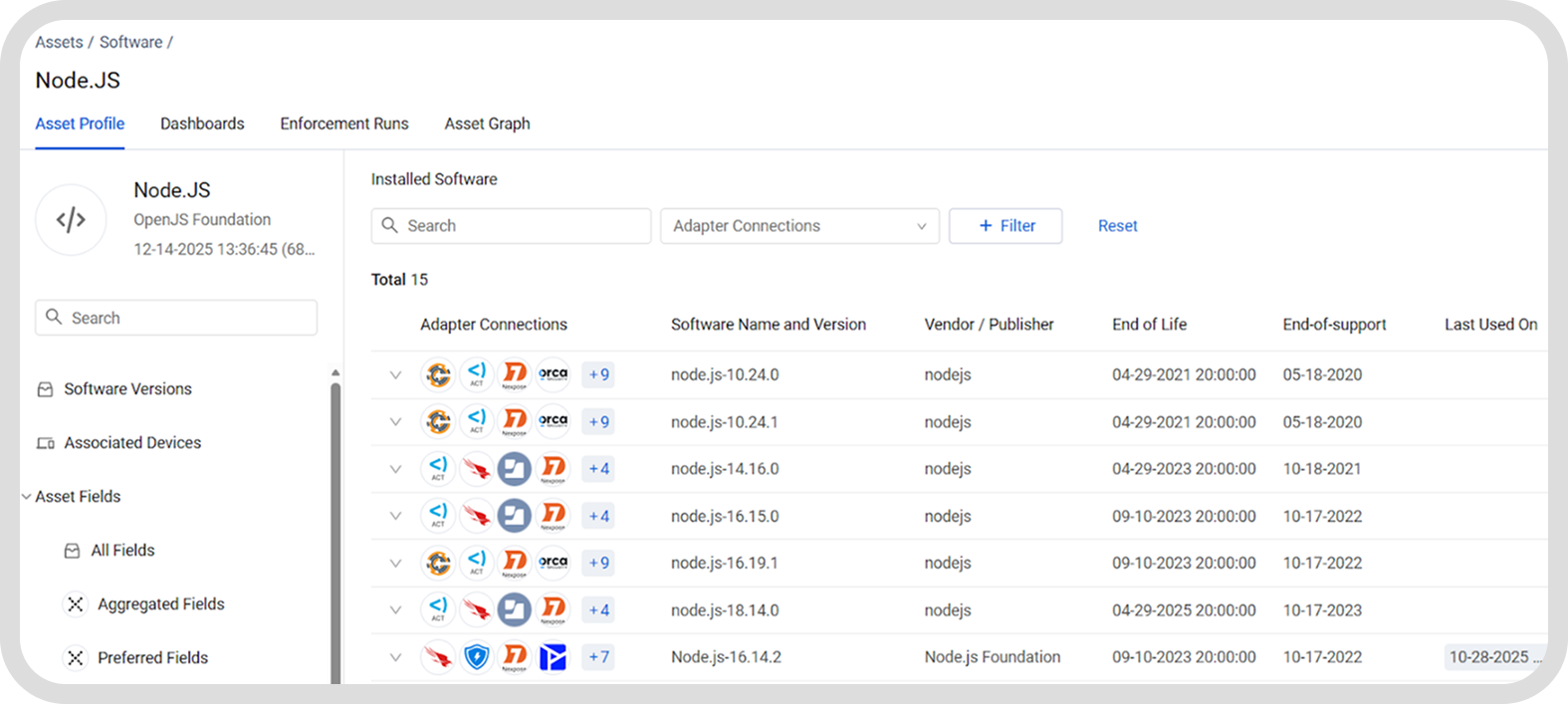 That’s where Axonius Software Assets comes in. Software is one of more than 40 asset types that the platform correlates with. With the ability to query software based on a subset of devices, Axonius is uniquely positioned to enable rapid identification of EOL/EOS software on edge devices.