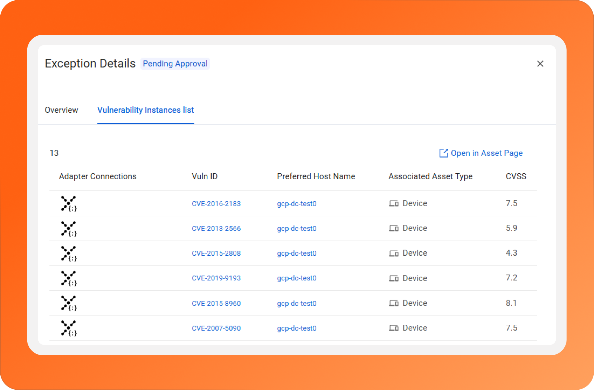 Exception Management, allied to Axonius Asset Intelligence, brings the full picture into focus. When you browse for an Exception, you get the exception request, asset, and exposure records from a single place. This gives your team the context and confidence they need at audit time.