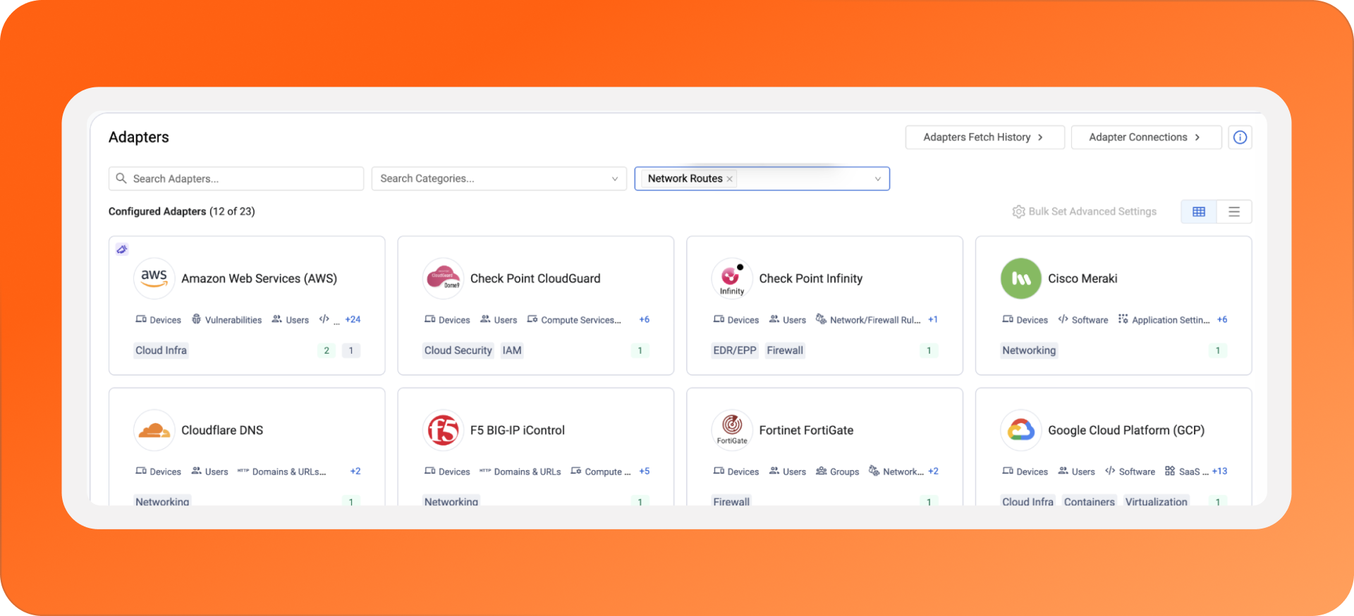 By combining External Exposures with the Axonius platform (1,200+ integrations/40+ asset types), you extend the visibility across multiple environments and planes.