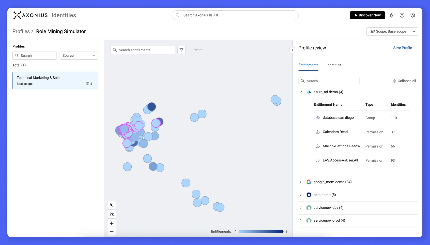 Profiles can be built manually, allowing teams to define precise entitlement sets based on internal policies or known access requirements. To accelerate the process, Axonius uses AI/ML to analyze entitlement patterns across users and recommend Profiles that reflect common, consistent access groupings.