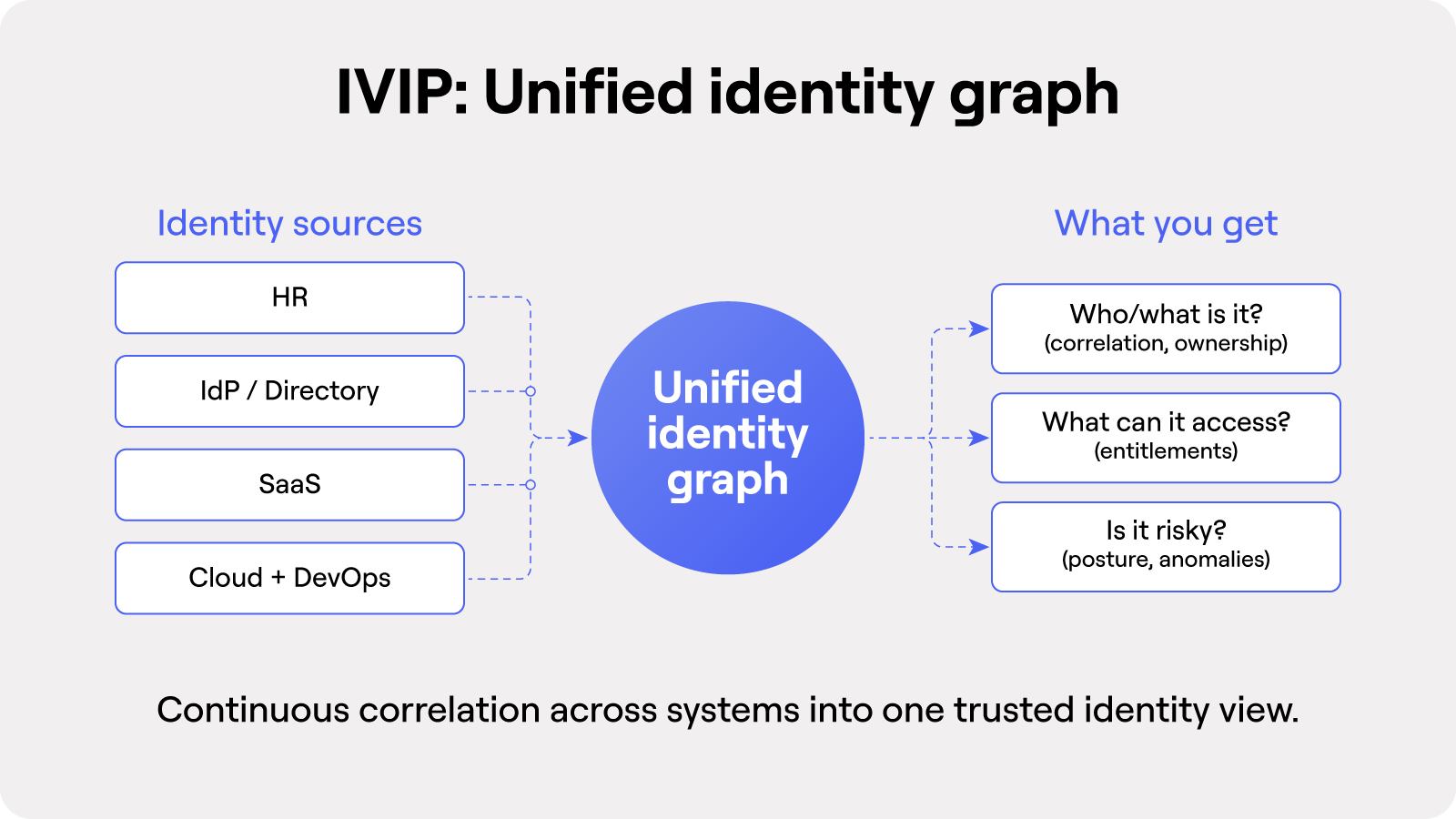 IVIP is about turning identity from a static dataset into a continuously evaluated security domain. Instead of treating identity as isolated accounts in separate systems, IVIP platforms build a unified identity graph. It correlates: identities and accounts across systems; entitlements and permissions; usage patterns and access behavior; and ownership and accountability.